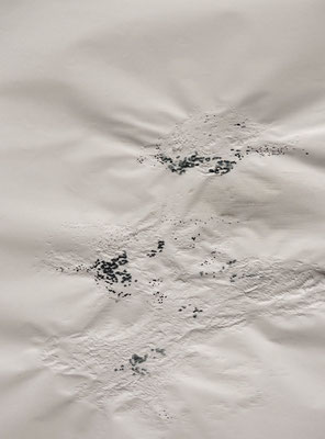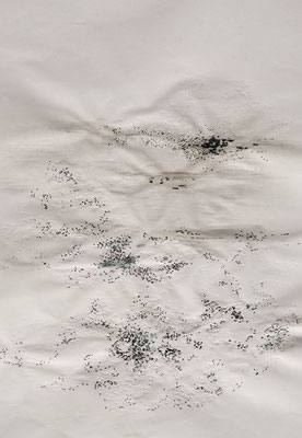 ...I drop a little ink with my black marker on the blister wich is not still wet. I try to delineate a part of this watery uncontrollable world. The paper begins to drink the ink greedily. It softly disperses. A spote radiates. The shape moulders. Fibers does not dehydrate at the same rate. Dry parts pull on those that are still wet. In certain places, the sheet wrinkles gently. While contracting, the support plays with the light, revealings its reliefs. The air rushes underneath and lifts it slightly from the next sheet. The paper begins to float.